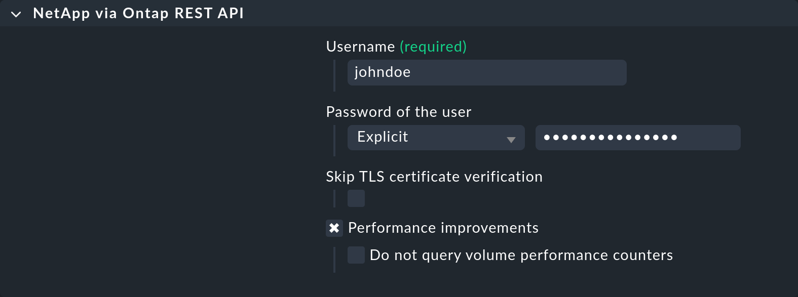 El agente especial agent_netapp_ontap accede a esta interfaz a través de una API-REST y se configura como un programa de origen de datos utilizando el conjunto de reglas NetApp via Ontap REST API. Los datos que necesita el agente especial pueden introducirse en el contenido de la regla, que casi siempre es algún tipo de dato de acceso. Con el agente especial de NetApp también hay una caja de check adicional para el registro de métricas (que aquí puede ser bastante exhaustivo):