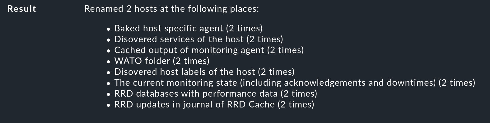 Rinominare gli host può sembrare un'operazione semplice a prima vista, ma a un'analisi più attenta si rivela un'operazione complessa. Il motivo è che Checkmk utilizza il nome dell'host come chiave univoca per l'operatore - e in effetti in numerosi luoghi. Questo include i nomi dei file, i dati di log, le regole, i dashboard, i report, le aggregazioni BI e altro ancora. Il nome di un host appare anche negli URL.