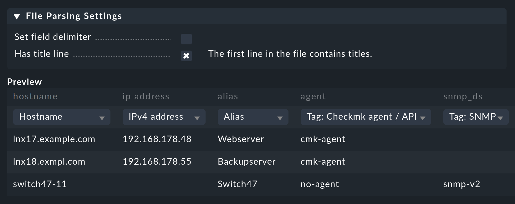 Checkmk è abbastanza flessibile nell'importazione di dati CSV. Nel caso più semplice, in ogni riga del file CSV è sufficiente avere un nome host risolvibile dal DNS:
