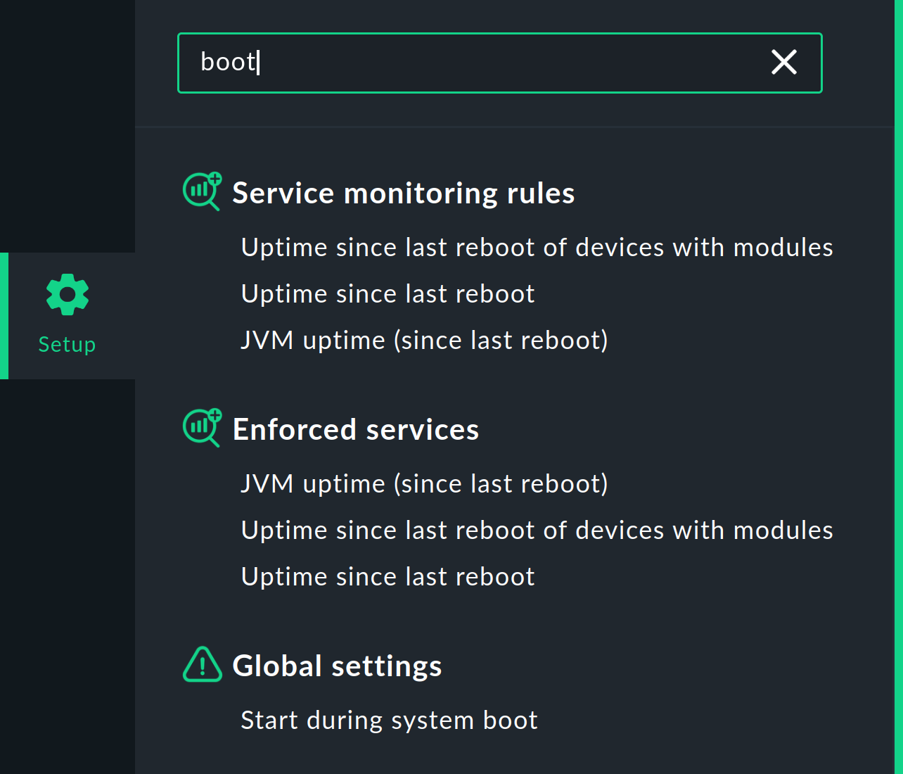 Utilizzando il campo di ricerca nel menu Setup, puoi cercare nell'ambiente di configurazione di Checkmk, cioè nel menu Setup stesso, con tutte le sue voci visibili e anche con alcune nascoste.