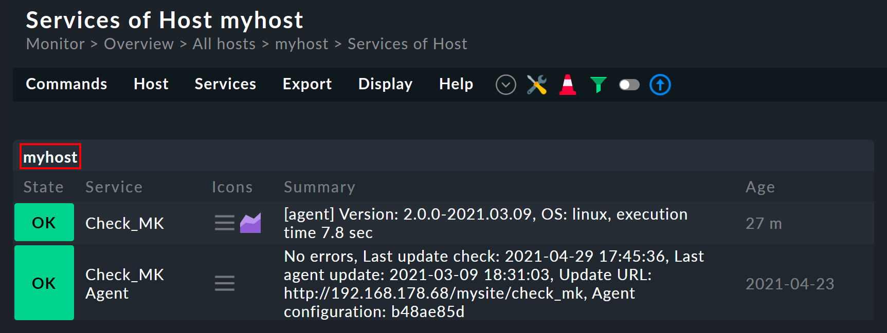 La scelta della visualizzazione dipende dal risultato della ricerca. Se la ricerca identifica esplicitamente un host, raggiungerai direttamente la pagina Services of Host … di questo host, dove troverai le voci di menu per le altre visualizzazioni di questo stesso host. Facendo clic sul nome dell'host, accederai alla visualizzazione Status of Host.